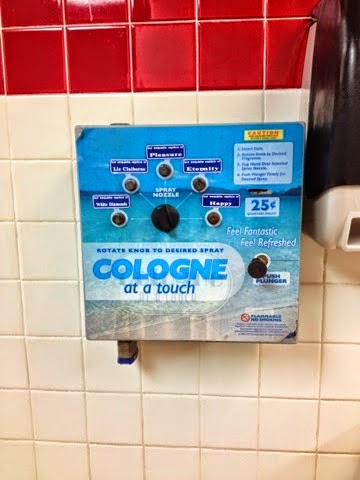 In case you're having trouble reading because of my fuzzy-picture taking...this is a device mounted on the wall of a bathroom. For a quarter it will spray you with "cologne".